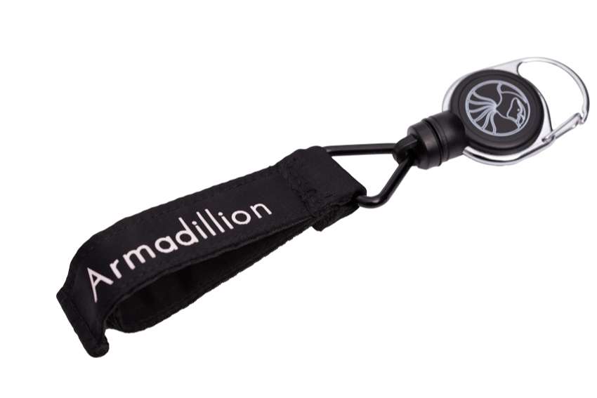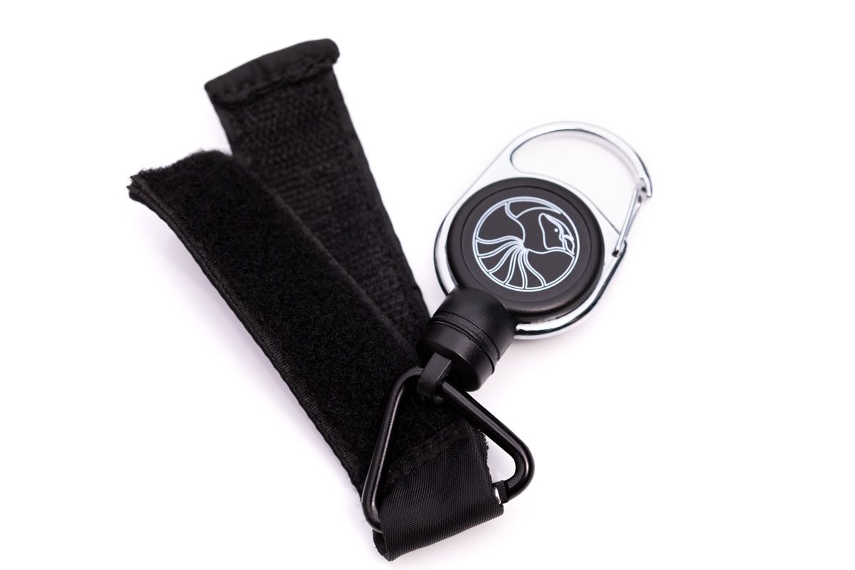 Ein kompakter Rückholmechanismus mit Federzug und starker Magnethalterung, befestigt mit einem Karabiner an Gürtel oder Gürtelschlaufe