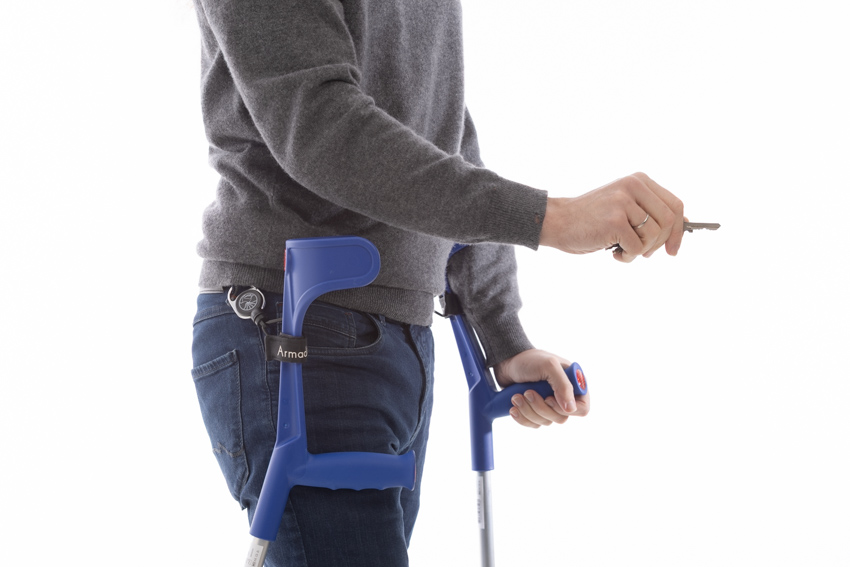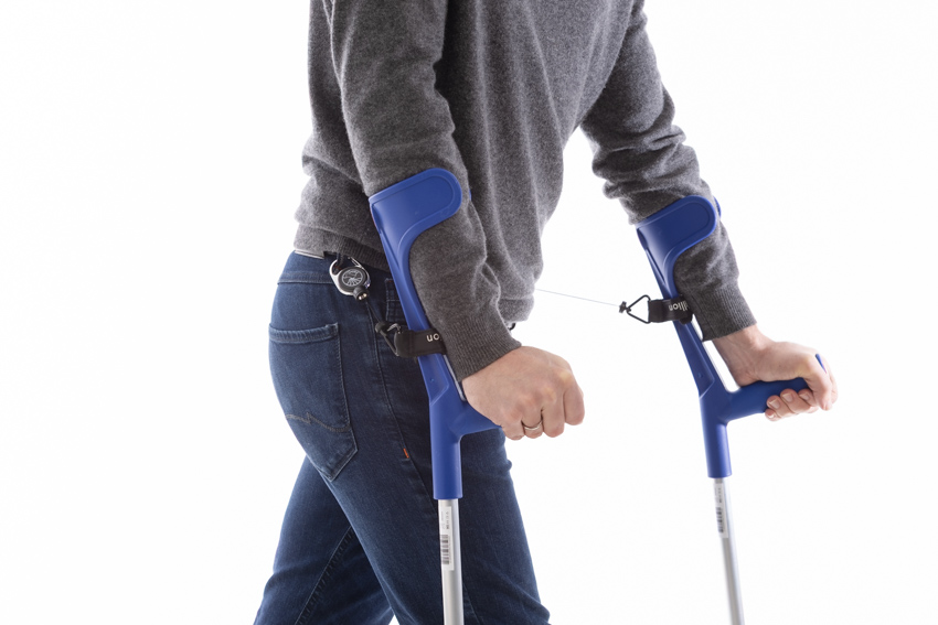 Durch unsere aktive Rückhholhilfe sind die Krücken immer mit dem Körper fixiert. Trotzdem ist kein verheddern in den Seilen möglich.